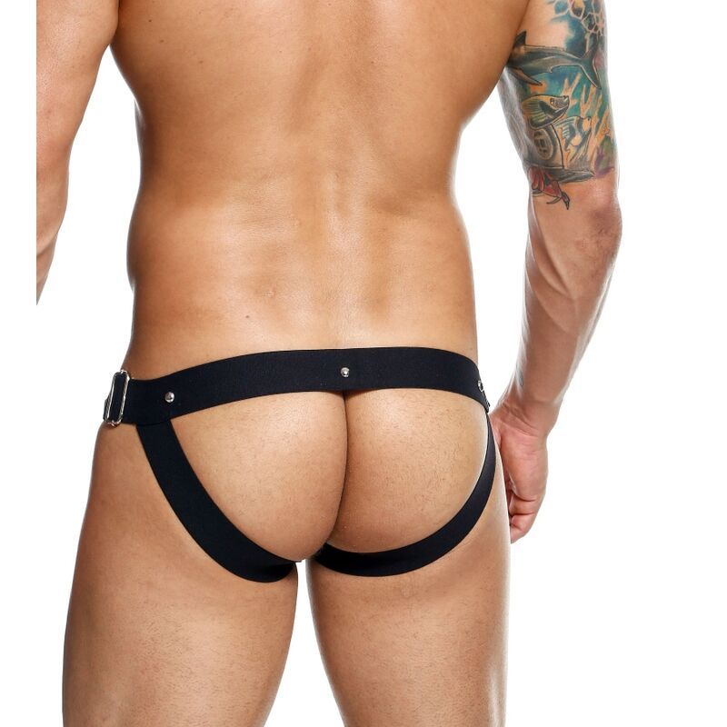 Le Snap Jockstrap est fait de similicuir solide en noir élégant. Avec une couverture minimale à l'arrière, la transpiration peut s'évaporer plus librement, offrant au porteur un ajustement plus confortable. Une pochette à maillons de chaîne à l'avant soutient le pénis sans lésiner sur le sex-appeal, tandis que de larges bretelles reposent sur les hanches pour une finition de soutien.
