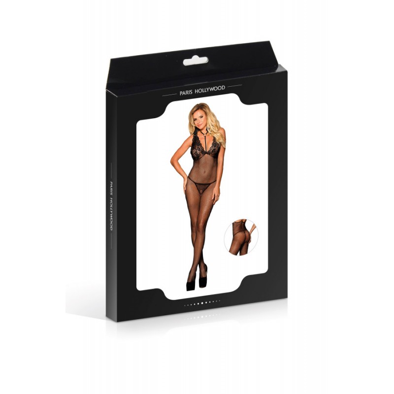 cette combinaison est ouverte à l'entre-jambes et son décolleté dentelle est sublimé d'un ornement tour de cou.