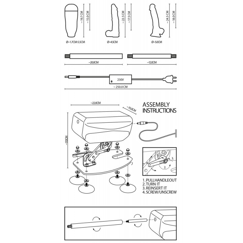 Machine sexuelle (22 cm x 15 cm x 16 cm) avec tige de rallonge (20 cm de long). Métal, ABS, PVC, TPE.