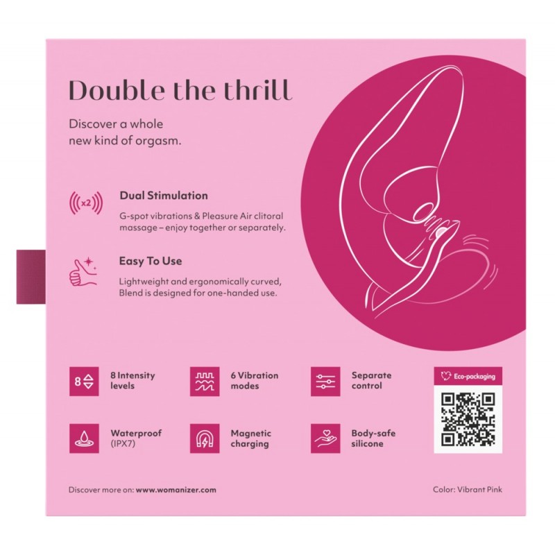 L'élégant BLEND de Womanizer combine la technologie révolutionnaire Pleasure Air avec une stimulation intensive du point G dans un seul jouet. Et cela dans un format très maniable et super facile à utiliser ! Le pulsateur gâte doucement le clitoris à l'extérieur, tandis qu'en même temps, dans le vagin, la zone G est gâtée par de puissantes vibrations. Il est ainsi possible d'obtenir des orgasmes mixtes sensationnels (blended orgasms) !