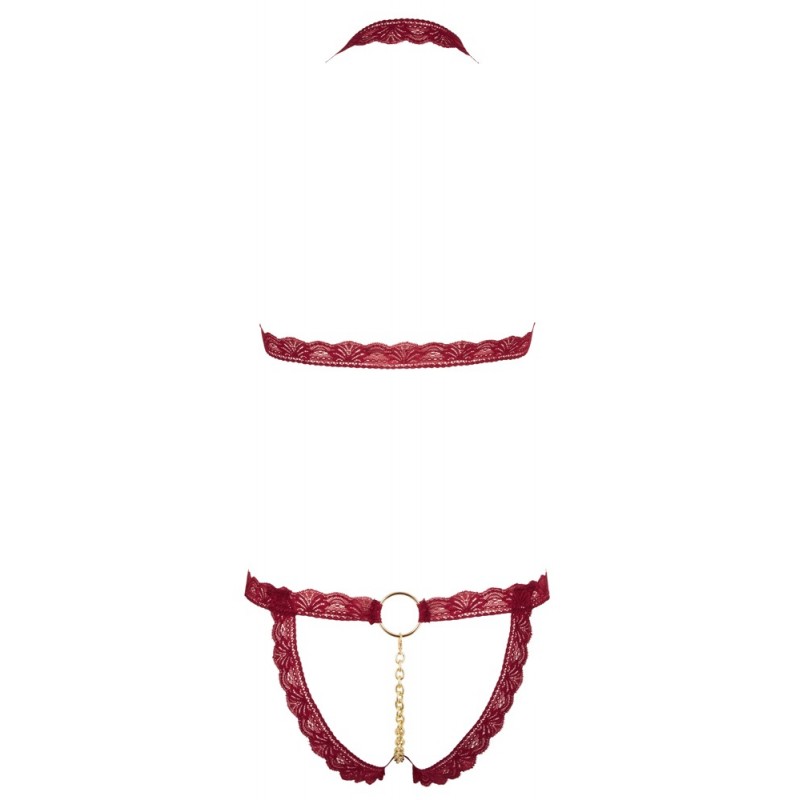 Ensemble soutien-gorge composé d'une bande de dentelle élastique avec des anneaux décoratifs en métal. Le string est complètement ouvert, la ficelle se présente avec une chaîne amovible à travers l'entrejambe ouvert (mousqueton à chaque extrémité). 90 % de polyamide, 10 % d'élasthanne.