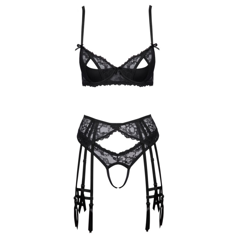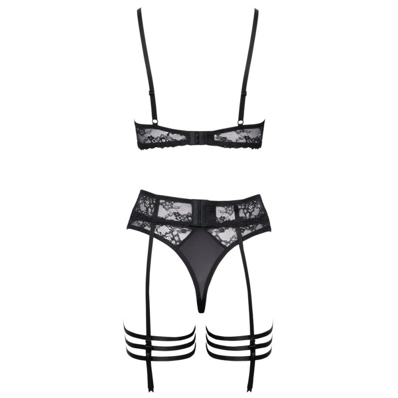 Ensemble jarretelles noir de Cottelli LINGERIE avec soutien-gorge à armatures, porte-jarretelles, string Rio et jarretelles stylées. Travaillé avec une fine dentelle stretch douce, jarretelles en jarretières stretch douces. Soutien-gorge à armatures avec demi-bonnets, surmonté de dentelle avec des découpes séduisantes. Les bretelles du soutien-gorge et la fermeture à crochets dans le dos sont réglables. Tout comme la fermeture à crochet à l'arrière du porte-jarretelles à la taille et les 8 jarretelles au total (6 devant, 2 derrière). Le string Rio séduit avec un devant ouvert.