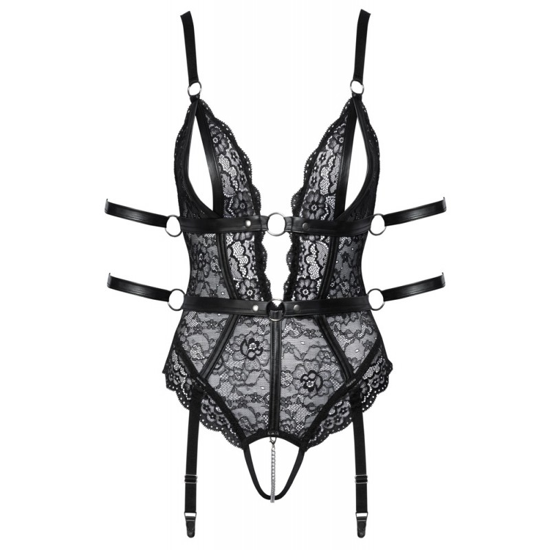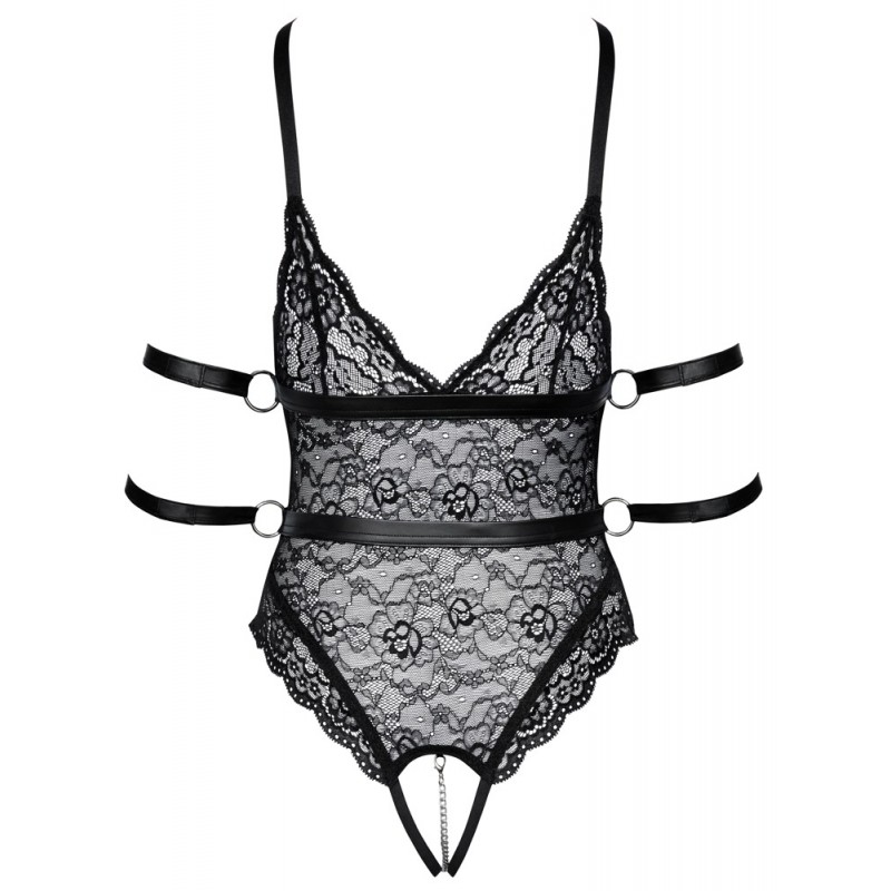 Body en dentelle ouvert de Cottelli BONDAGE avec 2 jarretelles amovibles et 4 liens de fixation. En dentelle douce et élastique noire avec des détails de lanières dans un look mat et des accessoires de couleur argentée. Décolleté profond à l'avant et à l'arrière. Bonnets souples, fendus de manière séduisante. Chaîne stimulante amovible à l'entrejambe entièrement ouvert. Ceinture cousue sous la poitrine et à la taille avec des anneaux sur les côtés, à travers lesquels on peut passer les 4 bandes de fixation pour les bras. Les attaches souples se mettent et s'enlèvent rapidement grâce à des fermetures velcro. Les deux jarretières sont réglables et entièrement amovibles.