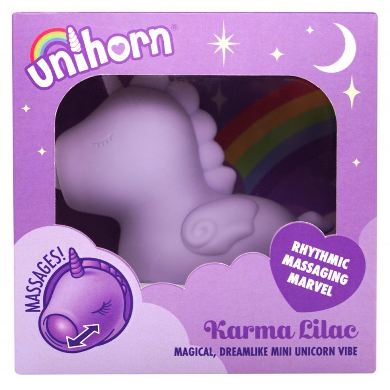 Adorable vibromasseur à poser Karma Lilac d'Unihorn en forme de petite licorne. Le jouet en silicone doux et maniable gâte avec ses vibrations variées et son petit bec de massage qui palpite intensément. Le double moteur de luxe assure une puissance fiable. Une simple pression sur un bouton permet de commander séparément 10 modes différents de vibration et de massage par tapotement. Un jouet magique pour des jeux variés - seul ou à deux - à la maison ou en voyage !