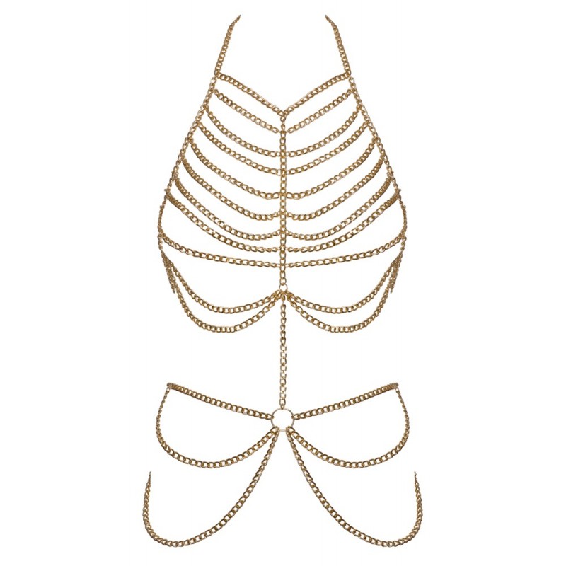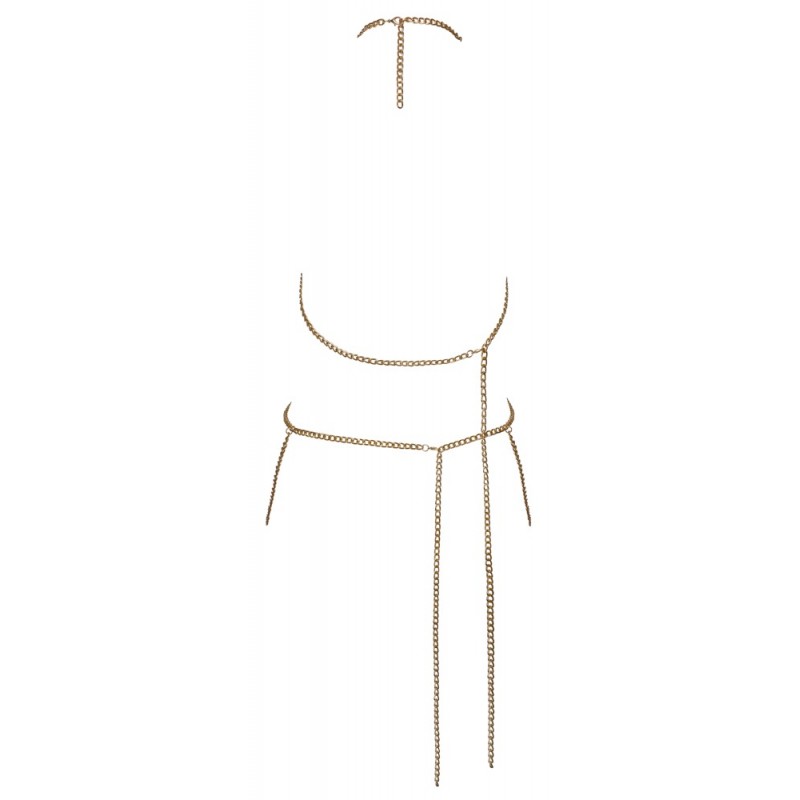 Chaîne de corps dorée de Cottelli ACCESSORIES en deux parties. Sur le devant, avec une somptueuse garniture de chaînes sur les seins et les hanches. Au niveau du cou et du dos nu, avec un total de 3 mousquetons réglables individuellement et adaptables. Qu'ils soient portés seuls comme lingerie pour une apparence érotique ou combinés avec style à des maillots de bain et des tenues moulantes, les bijoux de corps glamour attirent toujours l'attention !