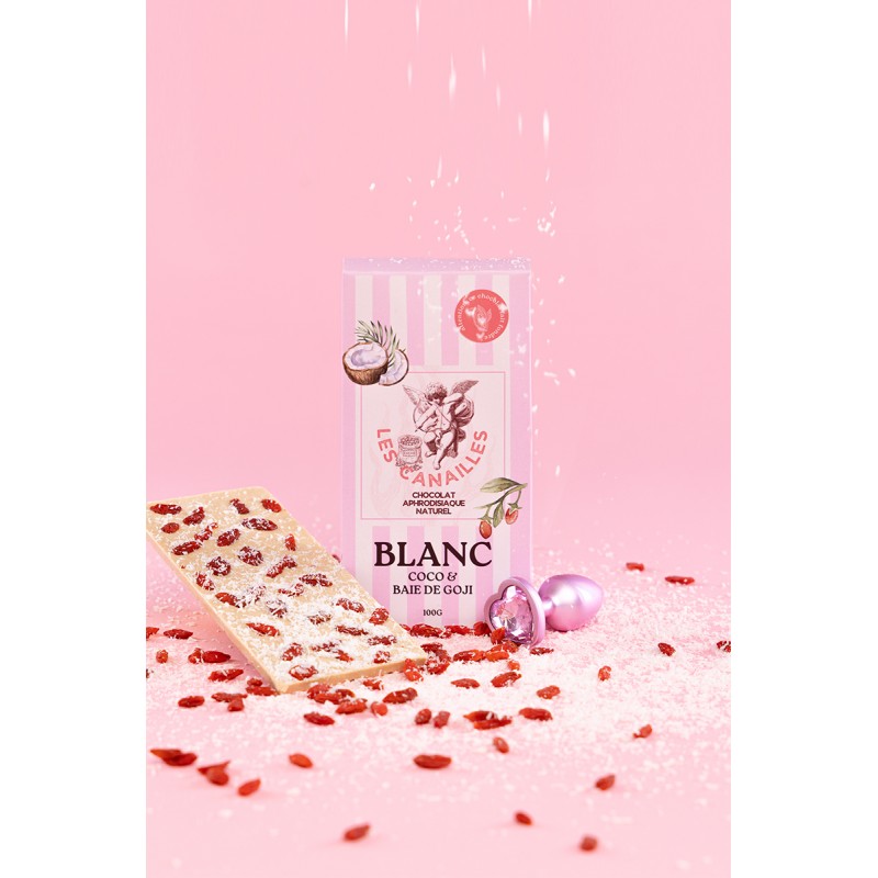 La marque française Les canailles présente son chocolat aphrodisiaque naturel blanc, au coco et baie de goji, en tablette de 100g.