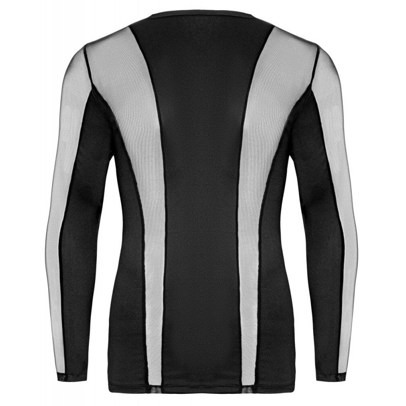 T-shirt noir à manches longues de Svenjoyment, qui souligne le corps, dans un jeu stylé de résille transparente et de matière stretch opaque. Le mélange de matières élastiques s'adapte à la peau et se porte très confortablement.