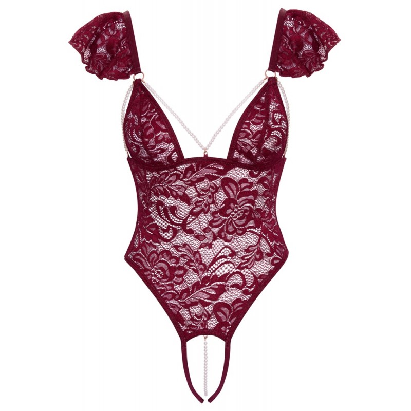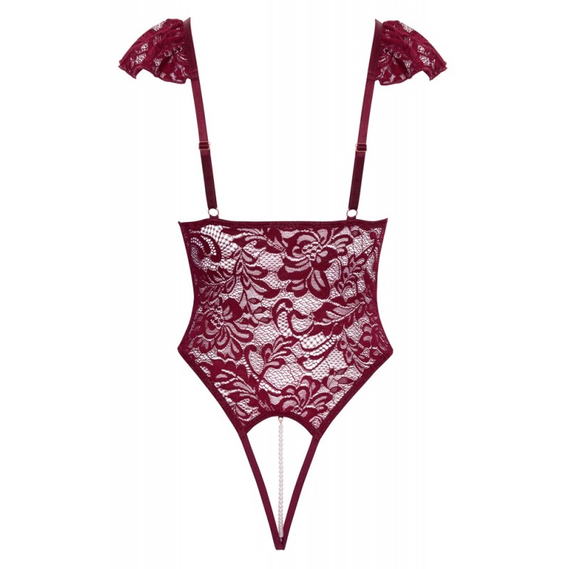 Stringbody ouvert bordeaux et rouge de Cottelli LINGERIE en douce dentelle florale stretch. Mise en scène séduisante avec une dentelle aux épaules, des chaînes de perles blanches et des détails couleur or rose. Doux et élastique pour un grand confort de port. Les colliers de perles sur les bonnets doux et le collier de perles stimulant à l'entrejambe ouvert et accueillant peuvent également être retirés du body en dentelle. Les bretelles sont réglables dans le dos.