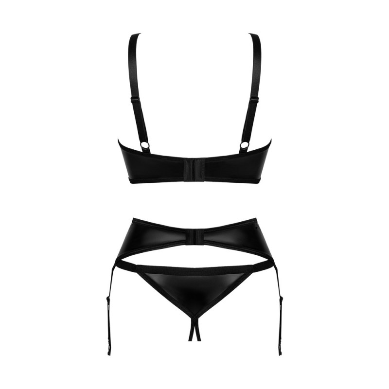 ensemble 3 pièces Armares de Obsessive avec soutien-gorge à armatures, porte-jarretelles et string ouvert. Entièrement réalisé dans un wetlook très tendance, élastique et doux au toucher. Bonnets avec des découpes séduisantes et un petit élément décoratif. Les bretelles au style raffiné avec des anneaux sont ajustables - tout comme la fermeture à crochets dans le dos. La jarretière est munie d'un anneau à l'avant et d'une fermeture à crochets réglable à l'arrière. Les jarretelles sont également réglables. Le string en wetlook est ouvert à l'entrejambe pour plus de séduction