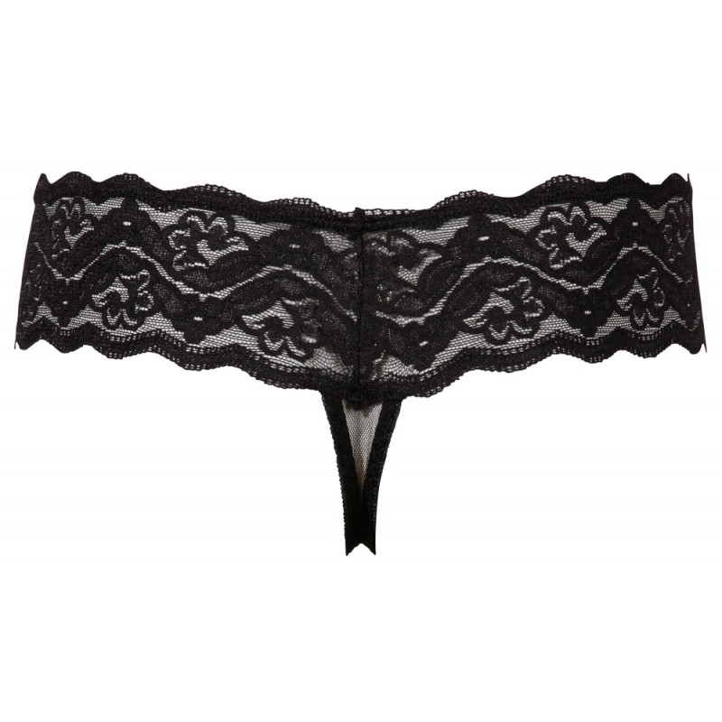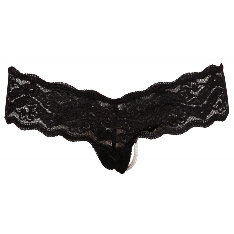 String Rio en dentelles noires et filet avec une chaîne de perles cousues dans l'entrejambe. 100% polyester.