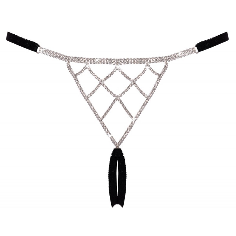 String ouvert luxueux de Cottelli LINGERIE en bandes stretch noires douces avec accessoires argentés. L'avant décoratif et le triangle arrière décoratif sont travaillés avec d'innombrables pierres de strass scintillantes. Les bandes élastiques latérales à la taille sont réglables. Séduisant et ouvert à l'entrejambe.