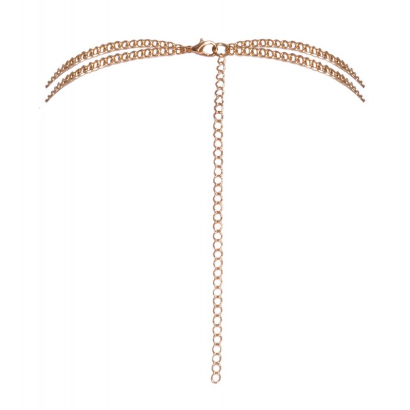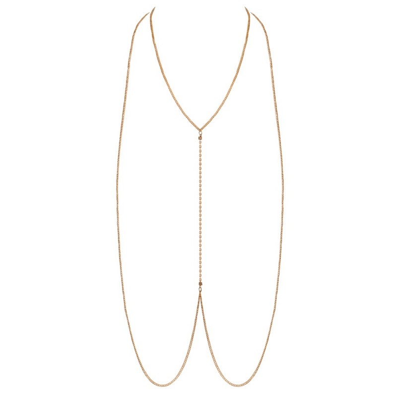 Chaîne de corps dorée de Cottelli ACCESSOIRES avec 2 longues chaînes dorées reliées entre elles par une chaîne en strass de 19 cm. Avec fermeture mousqueton dans la nuque et chaîne de rallonge réglable (15 cm de long). Porté pur sur la peau, un look érotique et stylé. La chaîne pour le corps peut également être combinée avec style avec des maillots de bain ou des tenues moulantes.