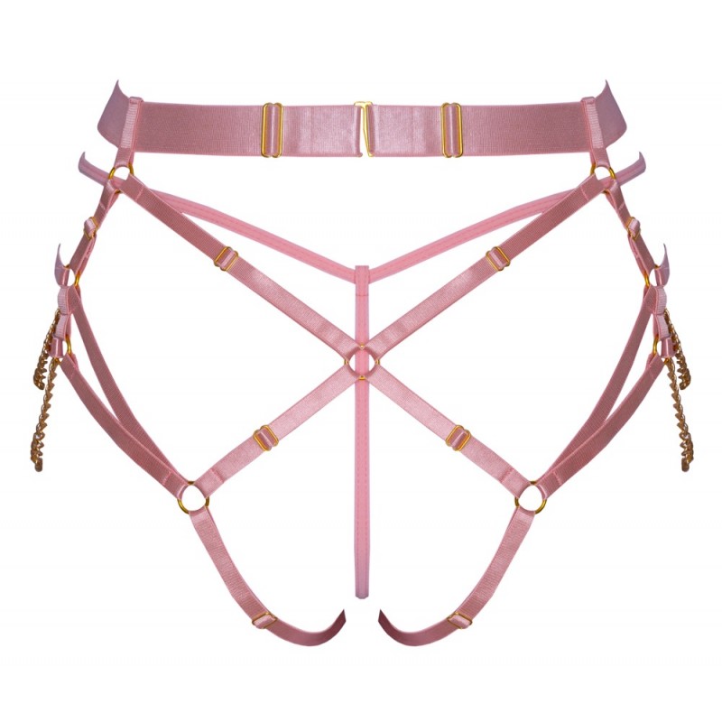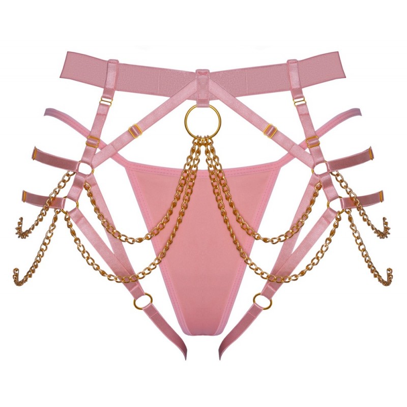 String harnais extravagant de Bad Kitty, mini-string inclus. String harnais en lanières stretch roses aux reflets nobles avec accessoires dorés. De plus, il est mis en scène de manière glamour avec des chaînes qui se balancent devant et sur les côtés. Les lanières élastiques souples et la ceinture plus large sont réglables à plusieurs reprises pour un ajustement parfait. Un mini-anneau rose est inclus pour un look moins révélateur.